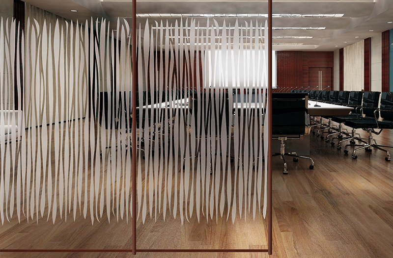 Le film décoratif adhésif pour vitre à bandes dépolies verticales épaisses INT 606 est composé de bandes dépolies verticales épaisses entremêlées.